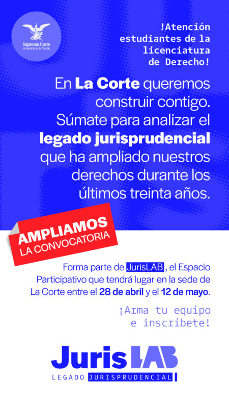 Suprema Corte de Justicia de la NaciónInfografías Gracias a tu interés, #JurisLAB extiende su convocatoria hasta el 30 de abril. Si aún no te has inscrito, es tu oportunidad para formar parte de este espacio de análisis jurisprudencial. Por Araceli Bastida - abril 28, 2025 0 FacebookTwitterPinterestLinkedinReddItEmailWhatsAppTelegramVK