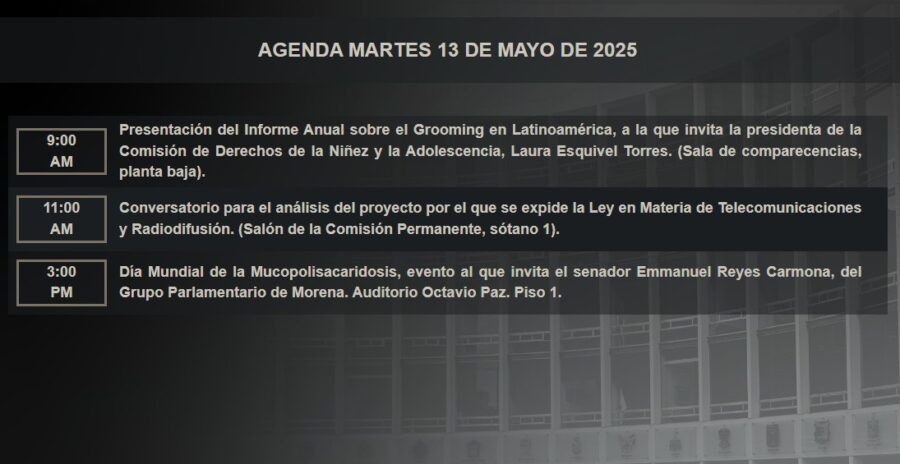 Senado de la RepublicaInfografías #HoyEnElSenado se desarrollará la siguiente agenda de actividades. Por Araceli Bastida - mayo 13, 2025 0 FacebookTwitterPinterestLinkedinReddItEmailWhatsAppTelegramVK
