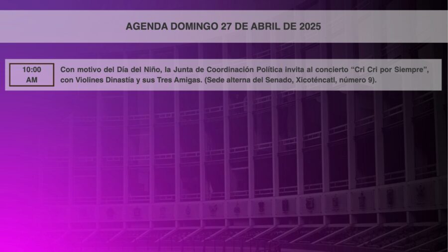 Senado de la RepublicaInfografías #HoyEnElSenado se desarrollará la siguiente agenda de actividades. Por Araceli Bastida - abril 27, 2025 0 FacebookTwitterPinterestLinkedinReddItEmailWhatsAppTelegramVK