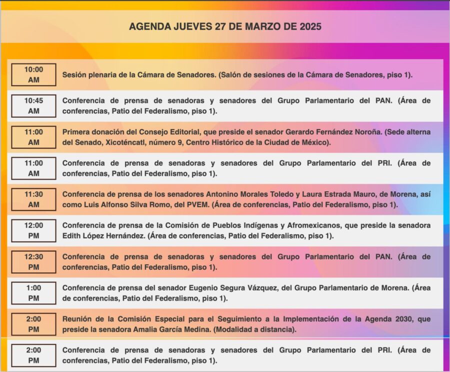 #HoyEnElSenado se desarrollará la siguiente agenda de actividades.