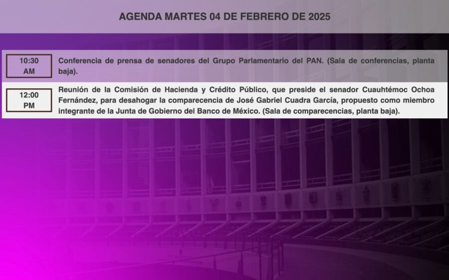 Senado de la RepublicaInfografías #HoyEnElSenado se desarrollará la siguiente agenda de actividades. Por Araceli Bastida - febrero 4, 2025 0 FacebookTwitterPinterestLinkedinReddItEmailWhatsAppTelegramVK