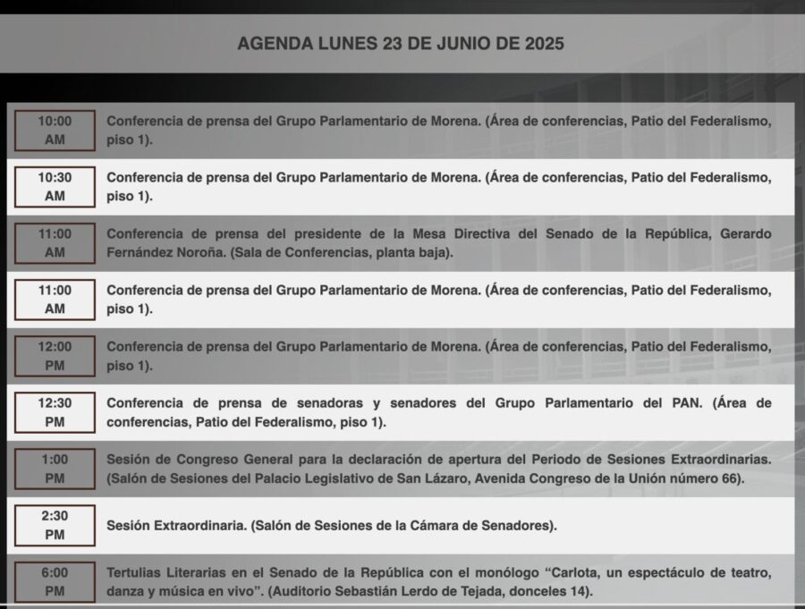 Senado de la RepublicaInfografías #HoyEnElSenado se desarrollará la siguiente agenda de actividades. Por Araceli Bastida - junio 23, 2025 0 FacebookTwitterPinterestLinkedinReddItEmailWhatsAppTelegramVK