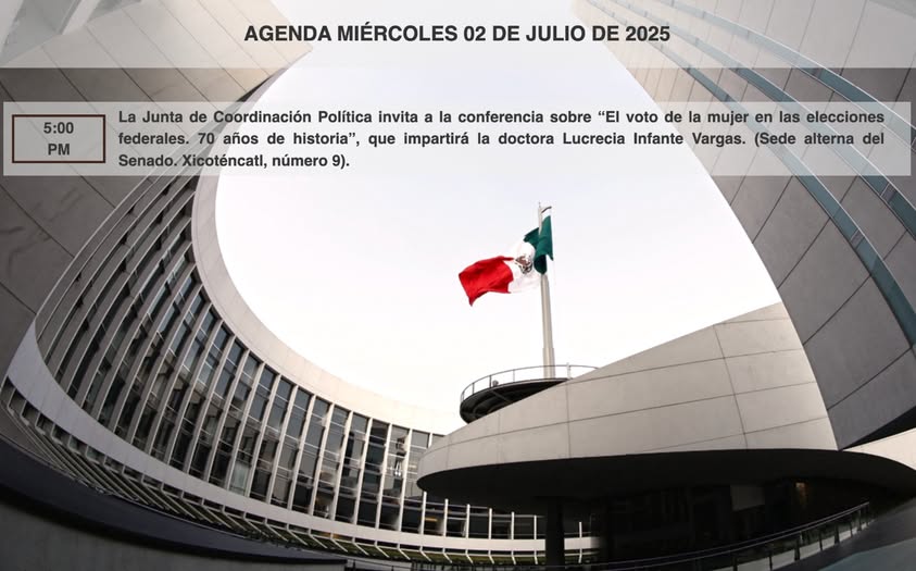 Senado de la RepublicaInfografías #HoyEnElSenado se desarrollará la siguiente agenda de actividades. Por Araceli Bastida - julio 2, 2025 0 FacebookTwitterPinterestLinkedinReddItEmailWhatsAppTelegramVK