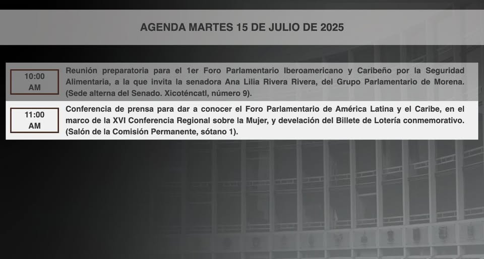Senado de la RepublicaInfografías #HoyEnElSenado se desarrollará la siguiente agenda de actividades. Por Araceli Bastida - julio 15, 2025 0 FacebookTwitterPinterestLinkedinReddItEmailWhatsAppTelegramVK