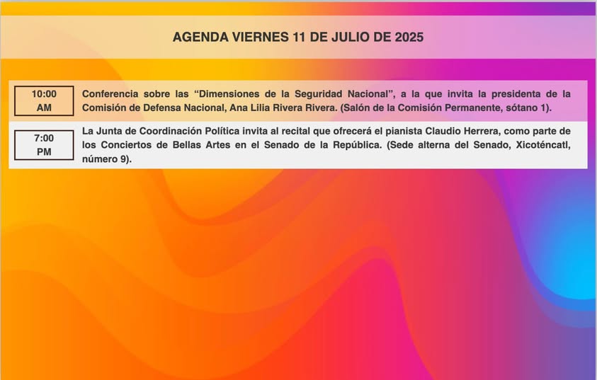 Senado de la RepublicaInfografías #HoyEnElSenado se desarrollará la siguiente agenda de actividades. Por Araceli Bastida - julio 11, 2025 0 FacebookTwitterPinterestLinkedinReddItEmailWhatsAppTelegramVK