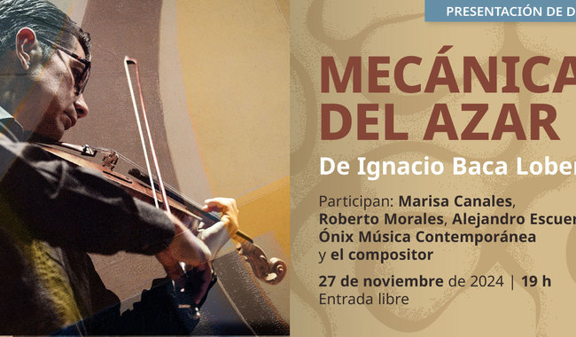 La cita para la presentación del disco Mecánica del azar, de Ignacio Baca Lobera, es el miércoles 27 de noviembre de 2024 a las 19:00 h en el auditorio Murray Schafer de la Fonoteca Nacional (Francisco Sosa 383, Barrio de Santa Catarina, Coyoacán, Ciudad de México). Entrada libre. Cupo limitado.