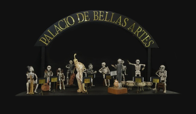 La orquesta, pieza principal de la ofrenda, está compuesta por nueve esqueletos y una cantante de ópera rodeados por 10 cráneos. Su diseño y ejecución fueron realizados por el Taller de Cerámica utilizando la técnica de raku yaki. Los instrumentos fueron elaborados en el Taller de Joyería. La creación de toda la obra tomó aproximadamente tres semanas y fue realizada por maestros y estudiantes de los diversos talleres del plantel del INBAL.