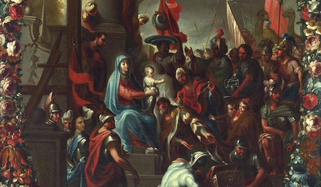 La epifanía (ca. 1655), de José Juárez “es una pieza de gran riqueza visual, donde el primer plano lo comparten la Virgen, que lleva al niño Jesús en su regazo, y los reyes Melchor y Gaspar. Este último está de figura completa y mira al espectador, interpelándolo. Otro detalle es que, en el copón de Melchor, el cual se encuentra en el piso, está la firma del autor”.