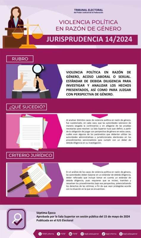 Tribunal Electoral del Poder Judicial de la FederaciónInfografías Jurisprudencia 14/2024 Rubro: Violencia política en razón de género, acoso laboral o sexual. Estándar de debida diligencia para investigar y analizar los hechos presentados, así como para juzgar con perspectiva de género. Por Araceli Bastida - marzo 28, 2025 0 FacebookTwitterPinterestLinkedinReddItEmailWhatsAppTelegramVK