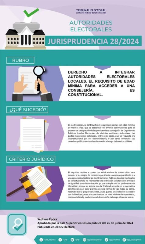 Jurisprudencia 28/2024 Rubro: Derecho a integrar autoridades electorales locales. El requisito de edad mínima para acceder a una consejería, es constitucional.