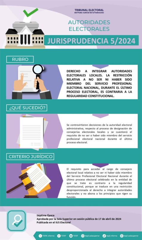 Jurisprudencia 5/2024 Rubro: Derecho a integrar autoridades electorales locales. La restricción relativa a no ser ni haber sido miembro del servicio profesional electoral nacional, durante el último proceso electoral, es contraria a la regularidad constitucional.