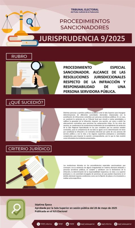 Inicio Tribunal Electoral del Poder Judicial de la Federación Infografías Jurisprudencia 9/2025 Rubro: Procedimiento especial sancionador. Alcance de las resoluciones jurisdiccionales respecto...