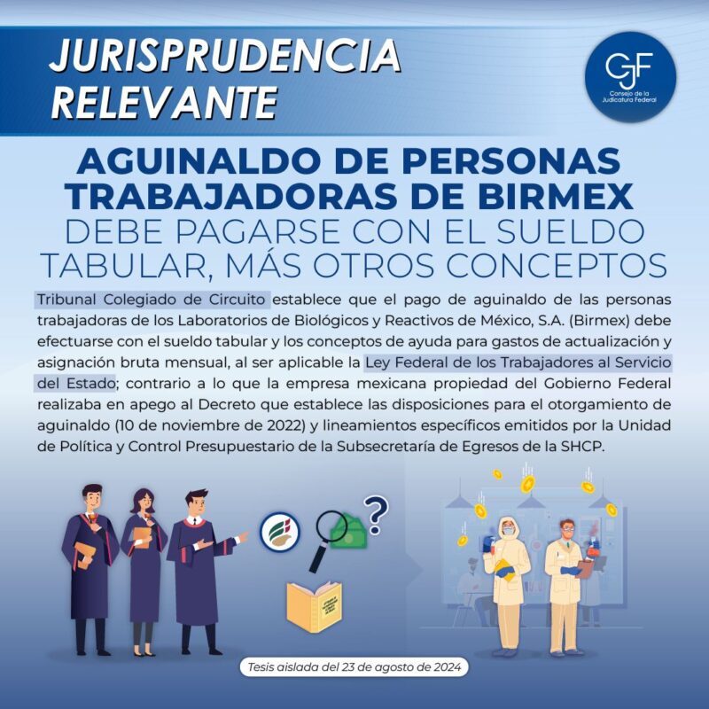Consejo de la Judicatura FederalInfografías #JurisprudenciaRelevante | Un Tribunal Colegiado de Circuito determinó que el aguinaldo de personas trabajadoras de BIRMEX debe pagarse con el sueldo tabular más otros conceptos. Por Araceli Bastida - diciembre 5, 2024 0 FacebookTwitterPinterestLinkedinReddItEmailWhatsAppTelegramVK