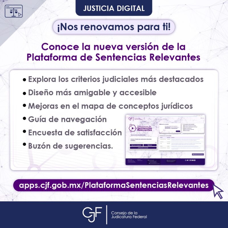 Consejo de la Judicatura FederalInfografías #JusticiaDigital | Conoce la nueva versión de la Plataforma de Sentencias Relevantes, que permite consultar sentencias emitidas por los órganos jurisdiccionales del #PJF . Por Araceli Bastida - diciembre 16, 2024 0 FacebookTwitterPinterestLinkedinReddItEmailWhatsAppTelegramVK