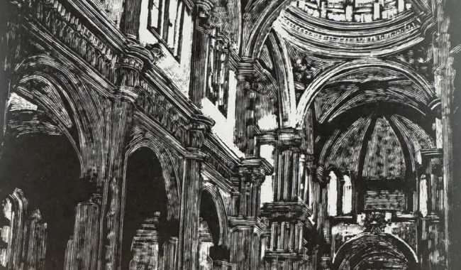 La exposición presenta trabajos a buril impresos en relieve sobre placa de plexiglás, pertenecientes a la serie dedicada a la arquitectura colonial y poscolonial de la ciudad de Durango.