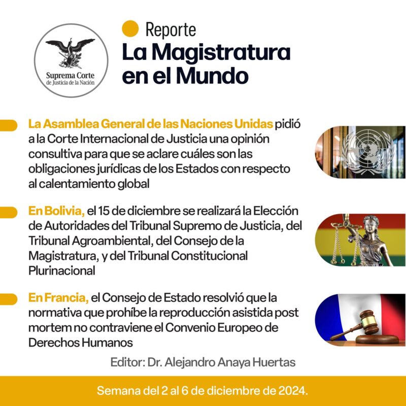 Suprema Corte de Justicia de la NaciónInfografías La Asamblea General de las Naciones Unidas pidió a la Corte Internacional de Justicia una opinión consultiva para que se aclare cuáles son las obligaciones jurídicas de los Estados con respecto al calentamiento global. Por Araceli Bastida - diciembre 9, 2024 0 FacebookTwitterPinterestLinkedinReddItEmailWhatsAppTelegramVK
