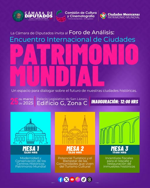 La Cámara de Diputados te invita al Foro de Análisis: Encuentro Internacional de Ciudades Patrimonio Mundial. Un espacio para dialogar sobre el futuro de nuestras ciudades históricas.