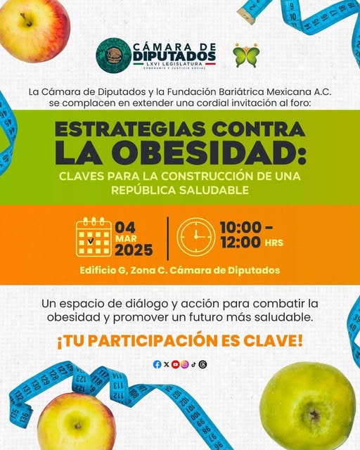 La #CámaraDeDiputados y la Fundación Bariátrica mexicana te invitamos al foro “Estrategias contra la obesidad: Claves para la construcción de una república saludable”. ¡Participa!