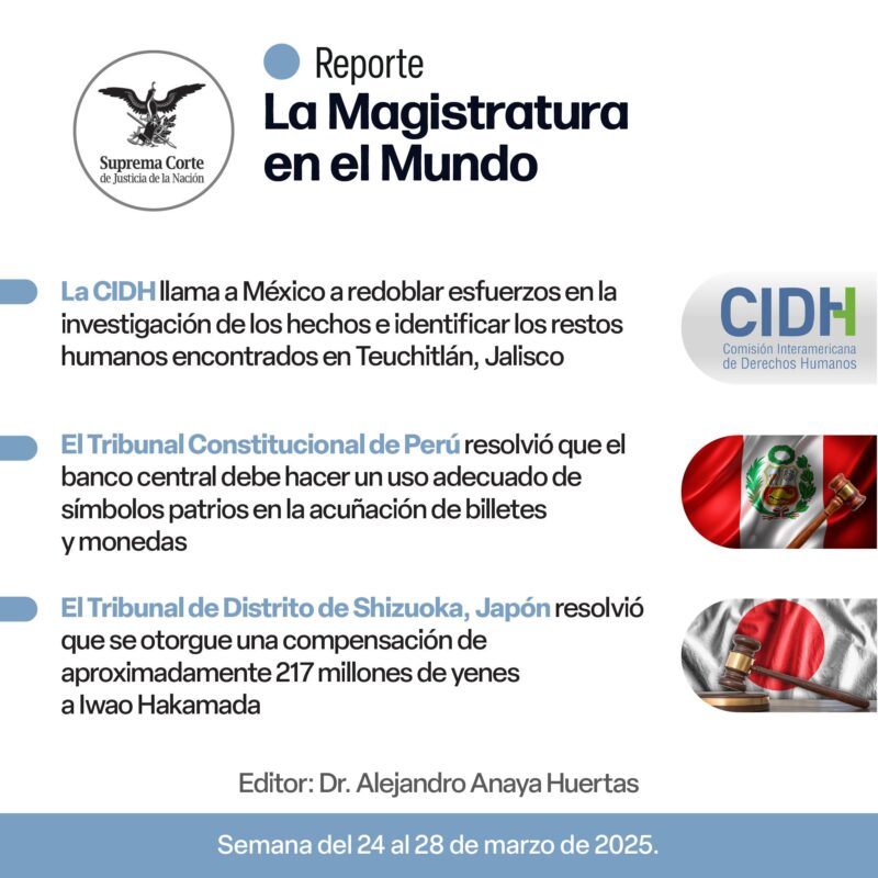 Suprema Corte de Justicia de la NaciónInfografías La CIDH llama a México a redoblar esfuerzos en la investigación de los hechos e identificar los restos humanos encontrados en Teuchitlán, Jalisco. Por Araceli Bastida - marzo 31, 2025 0 FacebookTwitterPinterestLinkedinReddItEmailWhatsAppTelegramVK