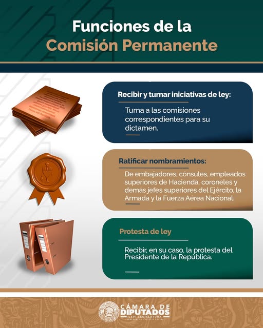 Camara de DiputadosInfografías La #ComisiónPermanente entra en funciones para garantizar la continuidad del trabajo parlamentario. ¿Su papel? Representar al Congreso de la Unión y atender asuntos urgentes mientras no hay sesiones ordinarias. #LXVILegislatura Por Araceli Bastida - mayo 15, 2025 0 FacebookTwitterPinterestLinkedinReddItEmailWhatsAppTelegramVK