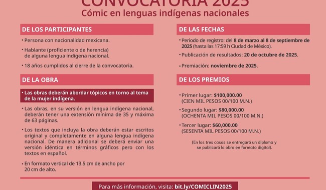 La Secretaría de Cultura del Gobierno de México, a través del Instituto Nacional de Lenguas Indígenas (INALI), mantiene abierta la Convocatoria 2025. Cómic en Lenguas Indígenas Nacionales, cuyo objetivo es reconocer el papel, la esencia y la fortaleza de las mujeres indígenas, así como promover el uso, fortalecimiento y difusión de las lenguas indígenas nacionales del país.