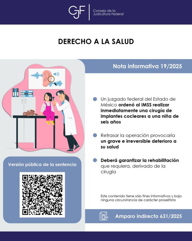Consejo de la Judicatura FederalInfografías La justicia federal ordena al #IMSS realizar, de forma inmediata, cirugía de implantes cocleares para una niña de seis años Por Araceli Bastida - junio 1, 2025 0 FacebookTwitterPinterestLinkedinReddItEmailWhatsAppTelegramVK