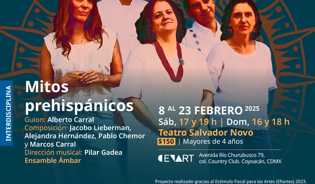 Mitos prehispánicos ofrecerá temporada en el Teatro Salvador Novo del 8 al 23 de febrero, con funciones los sábados a las 17:00 y 19:00 h, domingos a las 16:00 y 18:00 h. La entrada tiene un costo de $150 pesos, con promoción de 2×1 comprando los miércoles a través de la página cenart.comprarboletos.com. Para más información, consulta la página cenart.gob.mx.