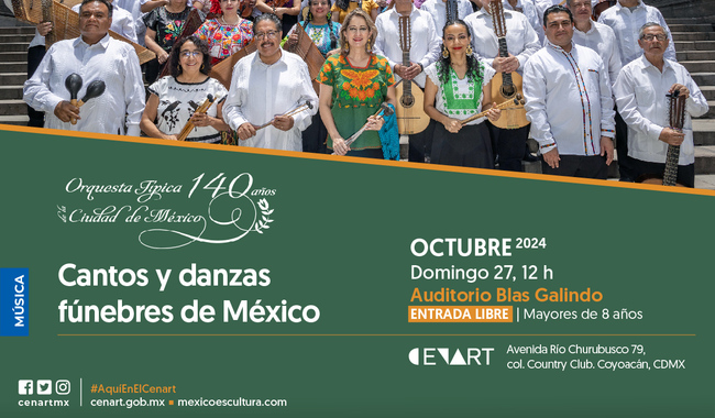 El concierto de Cantos y danzas fúnebres de México, con la Orquesta Típica de la Ciudad de México, se llevará a cabo el domingo 27 de octubre a las 12:00 h. La entrada es libre. Para más información, consulta la página cenart.gob.mx.