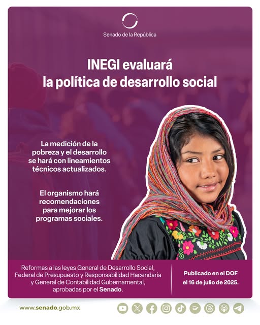 Senado de la RepublicaInfografías La reforma que aprobó el Senado para que el INEGI sea el encargado de medir el impacto de los programas sociales, ya fue publicada en el Diario Oficial de la Federación. Por Araceli Bastida - julio 30, 2025 0 FacebookTwitterPinterestLinkedinReddItEmailWhatsAppTelegramVK