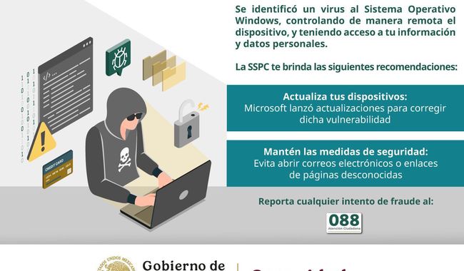 La Dirección General de Gestión de Servicios, Ciberseguridad y Desarrollo Tecnológico, de la Secretaría de Seguridad y Protección Ciudadana (SSPC), emite una alerta para proteger equipos de cómputo ante ataques cibernéticos que buscan controlar de manera remota los dispositivos.