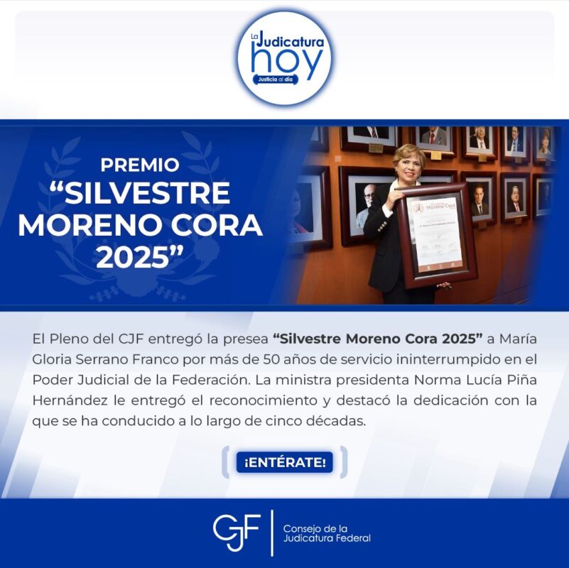 Consejo de la Judicatura FederalInfografías #LaJudicaturaHoy | En #JusticiaAlDía te contamos todo sobre la entrega del premio “Silvestre Moreno Cora 2025” a María Gloria Serrano Franco. Por Araceli Bastida - junio 20, 2025 0 FacebookTwitterPinterestLinkedinReddItEmailWhatsAppTelegramVK