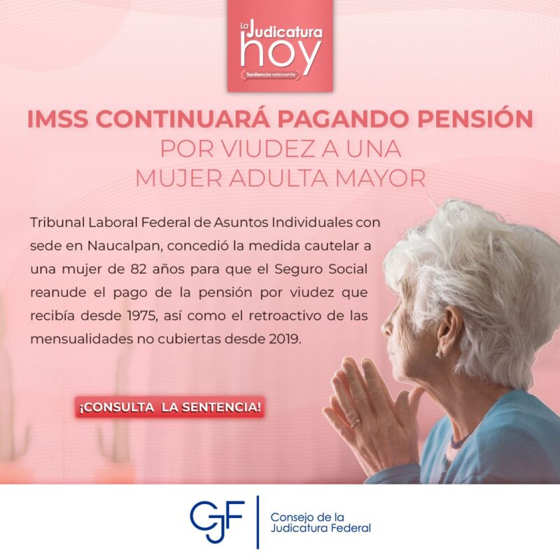 Consejo de la Judicatura FederalInfografías #LaJudicaturaHoy | Esta semana en #SentenciaRelevante, la #JusticiaFederal protegió a una mujer de 82 años al ordenarle al #IMSS continuar pagando su pensión por viudez. Por Araceli Bastida - diciembre 6, 2024 0 FacebookTwitterPinterestLinkedinReddItEmailWhatsAppTelegramVK