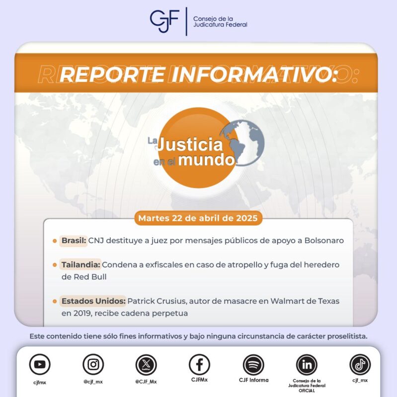 Consejo de la Judicatura FederalInfografías #LaJusticiaEnElMundo | Te compartimos las noticias más relevantes en materia de justicia internacional Por Araceli Bastida - abril 22, 2025 0 FacebookTwitterPinterestLinkedinReddItEmailWhatsAppTelegramVK