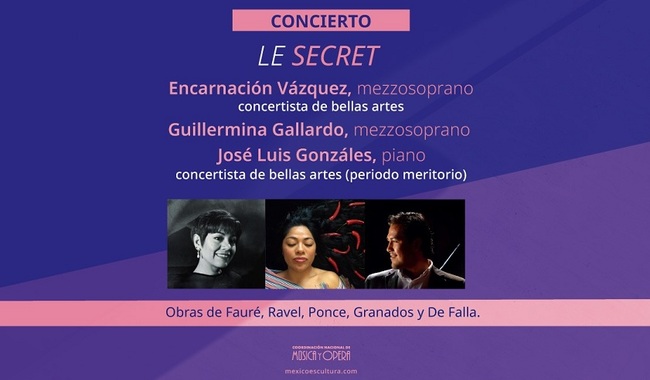 Las mezzosopranos Encarnación Vázquez y Guillermina Gallardo ofrecerán el concierto Le Secret, acompañadas del pianista José Luis González, en el que interpretarán obras de Fauré, Ravel, Ponce, Granados y De Falla, el 30 de enero a las 18 horas, en la sala Manuel M. Ponce del Palacio de Bellas Artes.