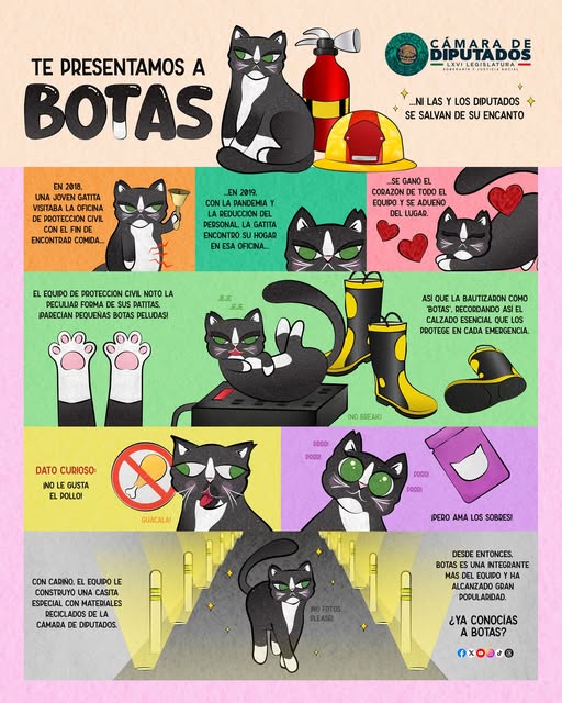 Llegó en busca de comida y encontró un hogar. Te presentamos a Botas, la gatita que robó el corazón del personal de Cámara de Diputados. ¿Sabías que le construyeron una casa con amor (y materiales reciclados)? Conoce su historia