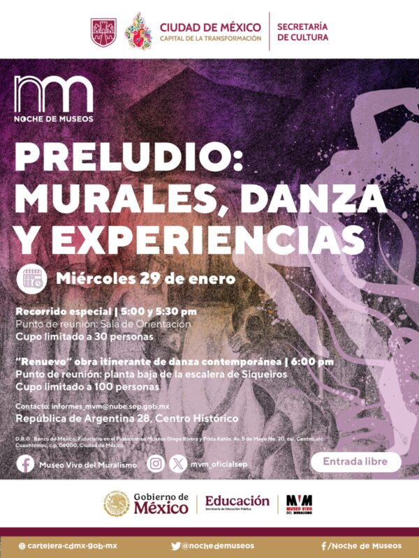 Para esta edición, el Museo Vivo del Muralismo se incorpora al programa con un recorrido especial por los murales que han dado vida a nuestra historia y la presentación de una obra itinerante de danza contemporánea “Renuevo”, misma que dialoga con el arte mural y transforma cada espacio en un escenario único; los recorridos se realizarán a las 17:00 y 17:30 horas, mientras que la obra se llevará a cabo a las 18:00 horas.