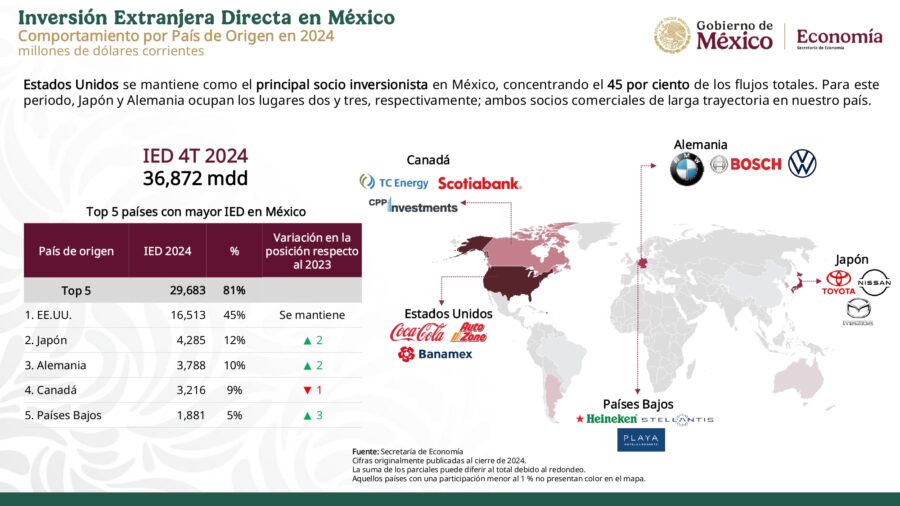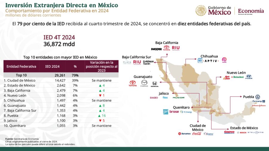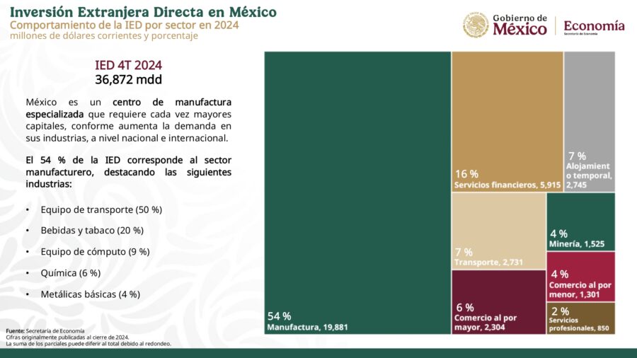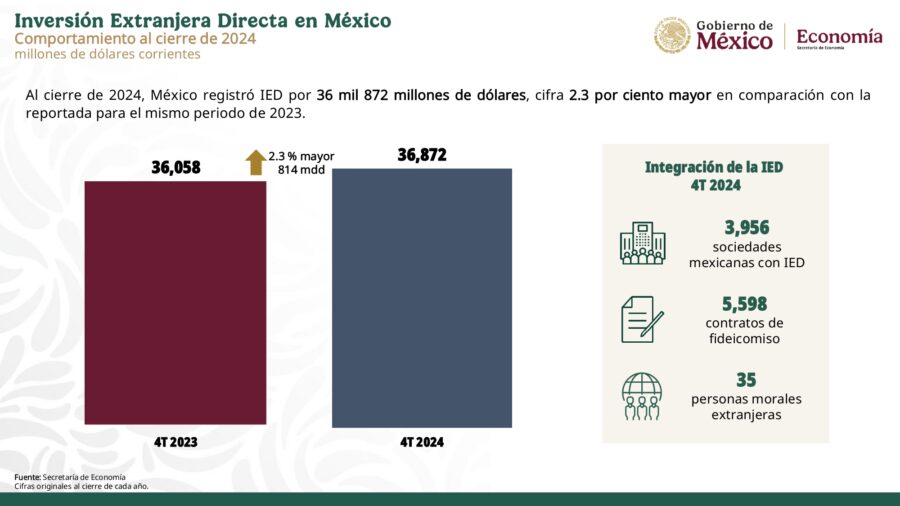 Secretarias09 Secretaría de EconomíaGobierno de México México recibió 36 mil 872 mdd de IED, nuevo máximo histórico Por Noticiero Gubernamental - febrero 25, 2025 0 65 FacebookTwitterPinterestLinkedinReddItEmailWhatsAppTelegramVK Inversión Extranjera Directa en México – Cuarto trimestre 2024 Secretaría de Economía | 25 de febrero de 2025 IED en México – Cuarto trimestre 2024 Descarga el documento completo aquí