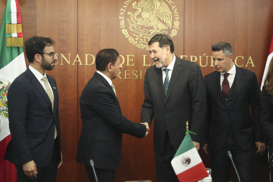 El presidente de la Mesa Directiva, Gerardo Fernández Noroña, y el presidente de la Comisión de Relaciones Exteriores, Alejandro Murat Hinojosa, se reunieron con Salem Rashed Alowais, embajador de Emiratos Árabes Unidos en México, a fin de impulsar acciones que fortalezcan el intercambio comercial, cultural y tecnológico entre ambas naciones.