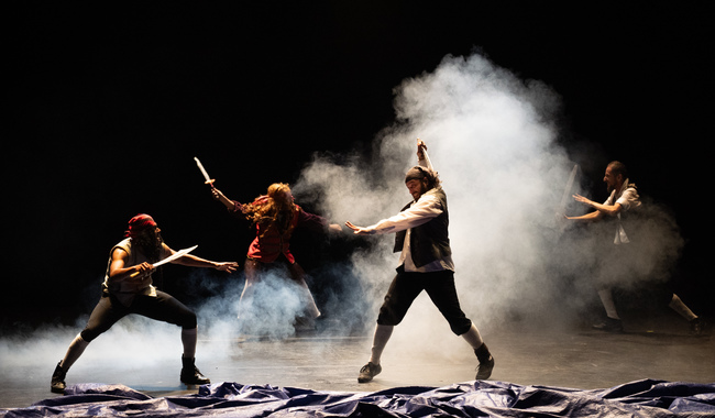 Desde el lenguaje corporal, la puesta construye una travesía marítima marcada por la intensidad y el vértigo: gestos y desplazamientos que salpican a la tripulación, el oleaje constante y la vulnerabilidad humana frente al impulso de dominio. Recursos visuales y el trabajo físico sumergen al público en el universo marino de Moby Dick.