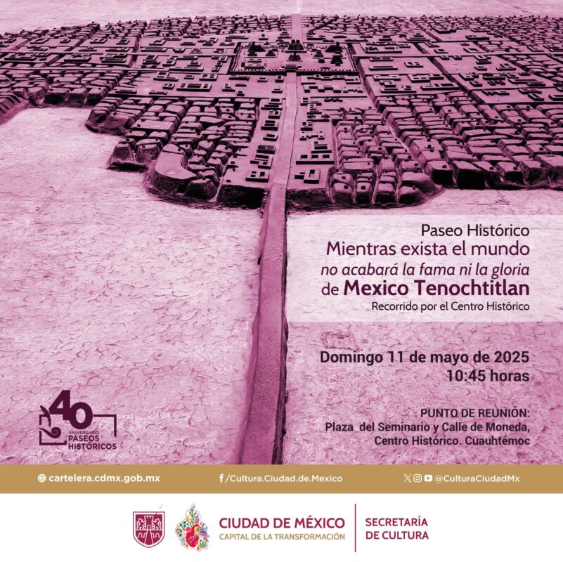 La cita para esta visita titulada “Mientras exista el mundo no acabará la gloria ni fama de México-Tenochtitlan” es en Plaza del Seminario esquina con Moneda, a las 10:45 horas. Las personas interesadas en acudir pueden identificar a las y los encargados del recorrido, quienes portan un chaleco con la leyenda “Paseos Históricos”; no se requiere registro previo.