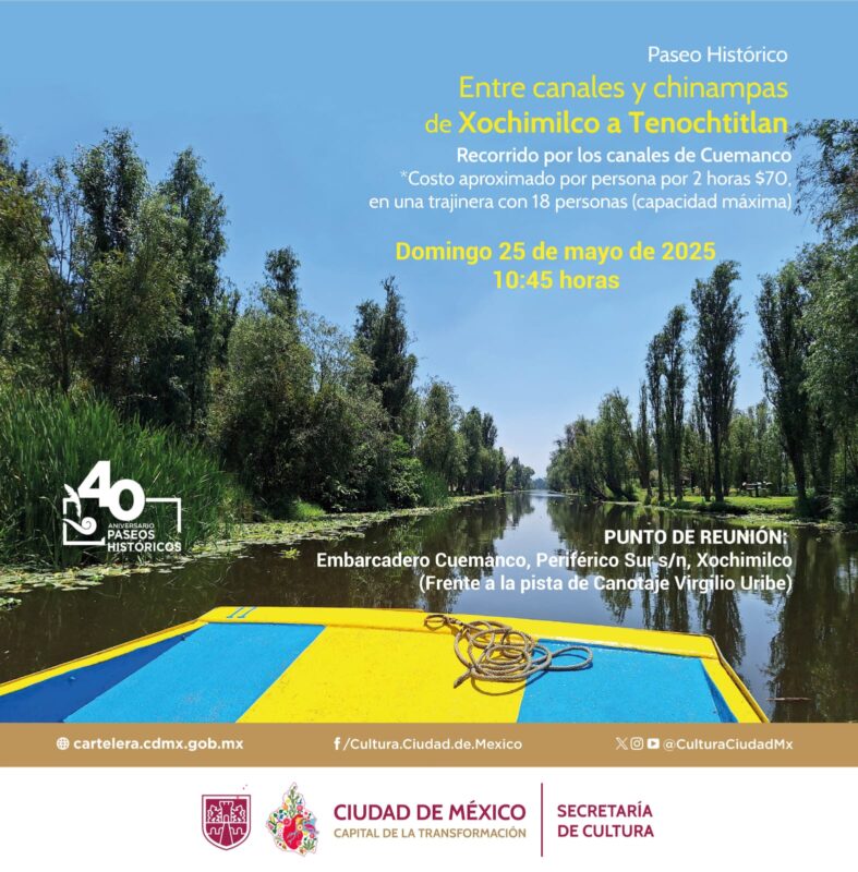 En el Paseo Histórico «Entre canales y chinampas, de Xochimilco a Tenochtitlan», el recorrido en trajinera tendrá un costo de 100 pesos por persona y un cupo máximo de 18 personas por trajinera. El punto de reunión es en el Embarcadero de Cuemanco, frente a la pista de canotaje Virgilio Uribe.