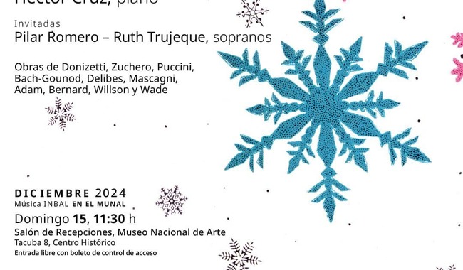 El concierto se llevará a cabo en el Salón de Recepciones del Museo Nacional de Arte (MUNAL) el domingo 15 de diciembre a las 11:30 h y contará con la participación del tenor Rodolfo Acosta, de las sopranos Pilar Romero y Ruth Trujeque y del pianista Héctor Cruz: todos ellos, cantantes e intérpretes de destacada trayectoria artística.