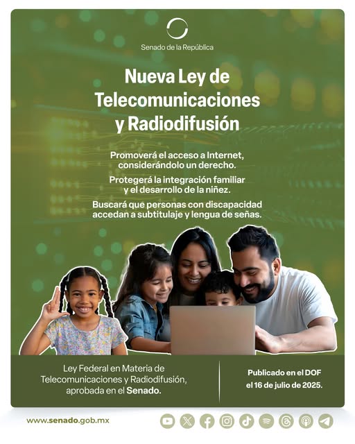 Senado de la RepublicaInfografías Para garantizar la inclusión digital y el fortalecimiento de derechos de personas usuarias, el Senado aprobó la creación de la Ley en Materia de Telecomunicaciones y Radiodifusión. Por Araceli Bastida - julio 28, 2025 0 FacebookTwitterPinterestLinkedinReddItEmailWhatsAppTelegramVK