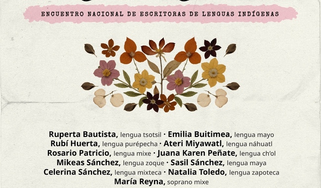 Como parte del Encuentro Nacional de Escritoras en Lenguas Indígenas, se llevará a cabo el Conversatorio Intergeneracional: Diálogos sobre escritura, emancipación y memoria, el viernes 14 de marzo a las 18 horas. En este conversatorio participarán Emma Cándida Estrada, Flor de Lluvia, Celic Aimee Jiménez Navarro, Lucelia Tapia Alvarado y María Julia López Vázquez, bajo la moderación de Susana Bautista. Durante el encuentro, conversarán sobre su tránsito en el universo de la literatura, los obstáculos que han atravesado y cómo han logrado establecer una poética a pesar de ellos.