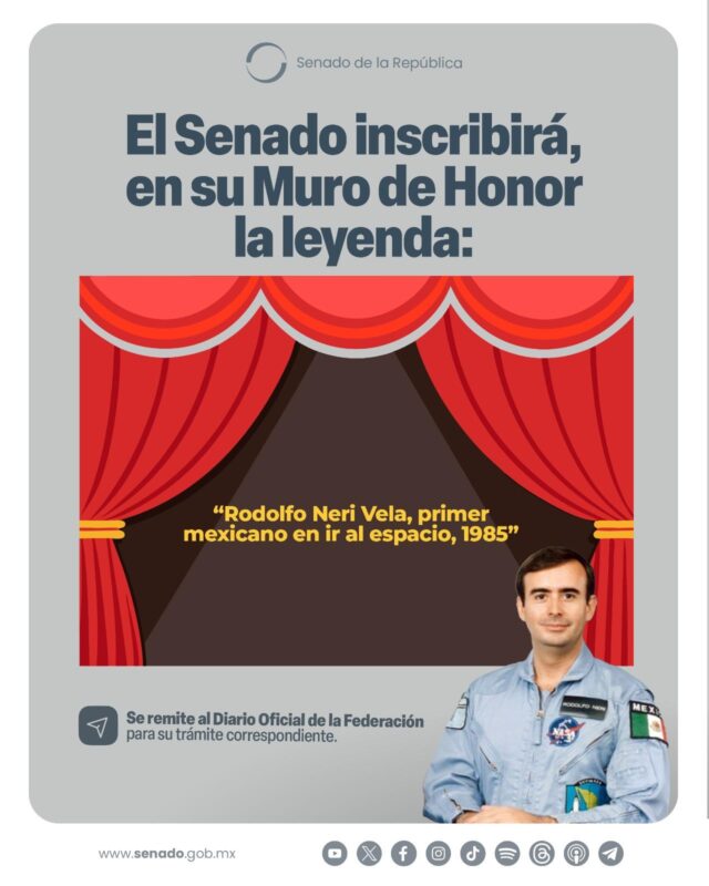 Por unanimidad, con 102 votos a favor, se aprueba inscribir en el Muro de Honor del Senado la leyenda “Rodolfo Neri Vela, primer mexicano en ir al espacio, 1985”.