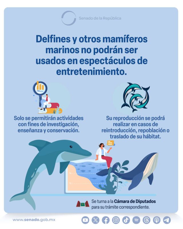 Senado de la RepublicaInfografías Porque todas las formas de vida merecen un trato digno y respetuoso, el Senado aprobó prohibir el uso de mamíferos marinos en espectáculos de entretenimiento. Por Araceli Bastida - junio 23, 2025 0 FacebookTwitterPinterestLinkedinReddItEmailWhatsAppTelegramVK
