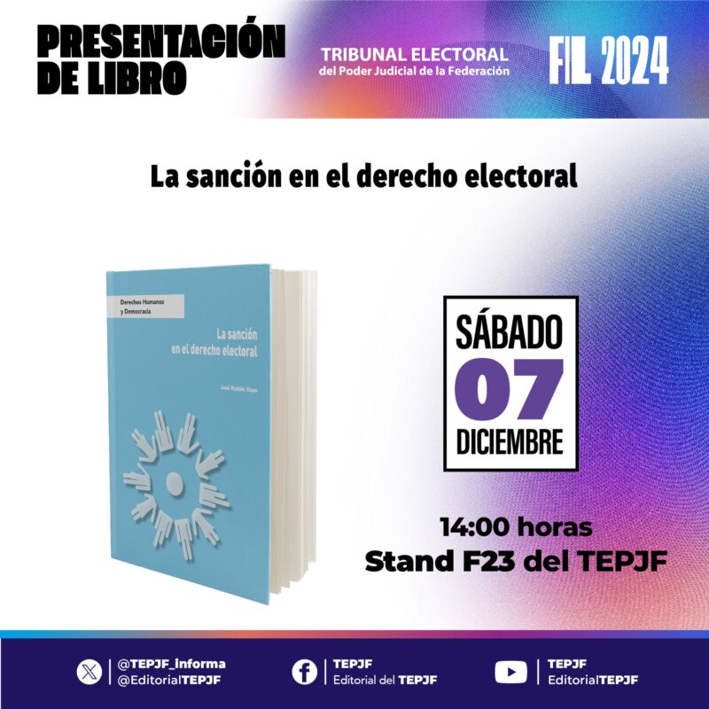 Tribunal Electoral del Poder Judicial de la FederaciónInfografías Presentación de libro: «La sanción en el derecho electoral», en el marco de la #FILGuadalajara. Por Araceli Bastida - diciembre 7, 2024 0 FacebookTwitterPinterestLinkedinReddItEmailWhatsAppTelegramVK