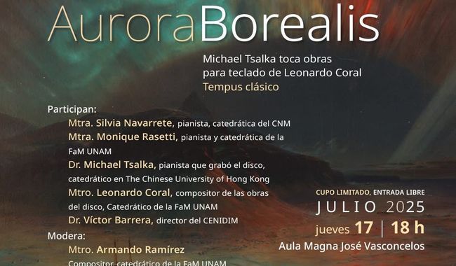 El Centro Nacional de Investigación, Documentación e Información Musical “Carlos Chávez” (CENIDIM), perteneciente a la Subdirección General de Educación e Investigación Artísticas (SGEIA) del Instituto Nacional de Bellas Artes y Literatura (INBAL), presentará el disco Aurora Borealis el próximo 17 de julio a las 18 horas, en el Aula Magna José Vasconcelos del Centro Nacional de las Artes. La entrada será libre.