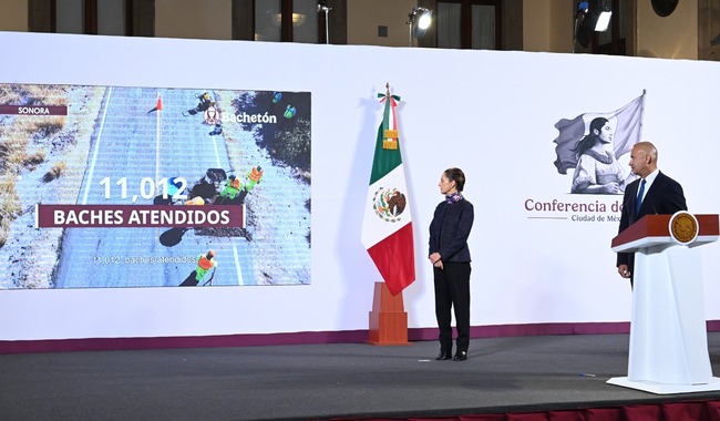 Ante la Presidenta Claudia Sheinbaum Pardo, el titular de la SICT dijo que se desplegaron 123 frentes de trabajo con más de 700 trabajadores y cerca de mil equipos.  Se repararon 11 mil 012 baches, equivalentes a 8 mil 780 toneladas de mezcla asfáltica y 54 mil 534 metros cuadrados.