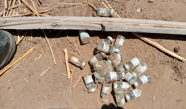 Asimismo, encontraron aproximadamente 400 envases vacíos de otras marcas y tipos de vacunas; algunos presentan indicios de haber sido incinerados. Estos residuos se encontraban de manera superficial sobre suelo natural enterrados a poca profundidad dentro de una caja de cartón.